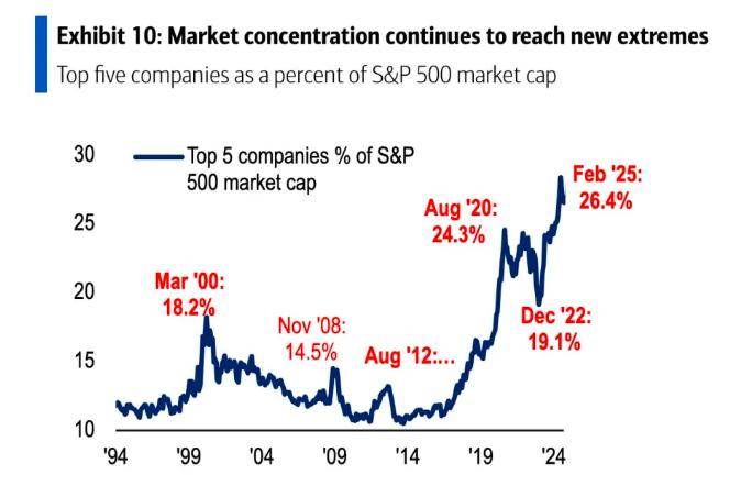 在美国,标普500指数中市值最大的五只股票,目前占该指数总市值的26.4%。