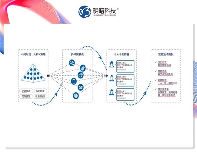 在营销自动化(MA)方面,除了市场上常见的渠道触达、条件判断、事件判断、生产标签、生产人群、延时等功能外,明略科技还增加了算法快速应用至流量分配的能力。在A/B测试中,为了均衡人群分布,如性别、会员等级等,明略引入了协变量能力,以科学的方式实现流量分配。此外,在算法层面,公司不仅提供算法分数查询,还增加了算法策略层,可以设置素材轮播、取最优逻辑、取最低逻辑等,结合营销旅程,实现滚动播放。