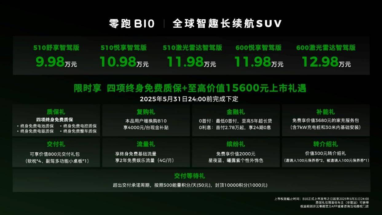 2025年4月10日,零跑汽车全新B系列首款全球化车型——零跑B10正式上市。新车共推出5款车型,包括510km和600km两种CLTC续航版本,其官方指导价格区间为9.98万元至12.98万元。作为一辆紧凑型SUV,零跑B10入门版车型续航就拔高到了用户更需要的500公里级别,做到了同级领先水平。同时,搭载激光雷达+高通双旗舰芯片的高配车型做到了11万级,且软件可通过OTA持续免费升级。智能硬件拉满,品质保障也可靠,电池、电驱、电控、整车四项终身免费质保都给到用户,真正做到“科技平权,好而不贵”,让卓越触手可及。