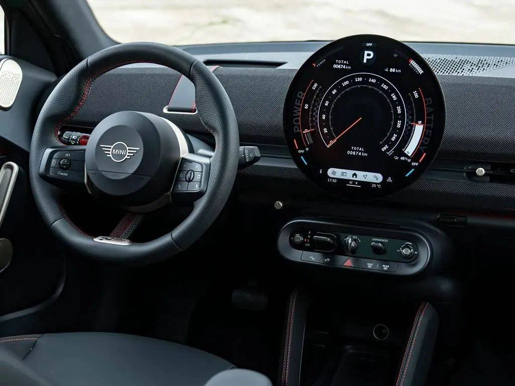 车内设计延续了MINI化繁为简的理念,全球首个240毫米圆形OLED中控屏成为交互核心,搭载第9代MINI操作系统,支持语音控制与个性化设置。物理按键精简至五个拨杆,用来控制挡位、启动等功能,搭配红黑拼色运动座椅,将数字化与驾驶仪式感巧妙融合。这种设计既避免了新能源车常见的屏幕堆砌,又通过如方向盘换挡拨片、方格旗纹理装饰等细节保留了性能车的机械魅力。