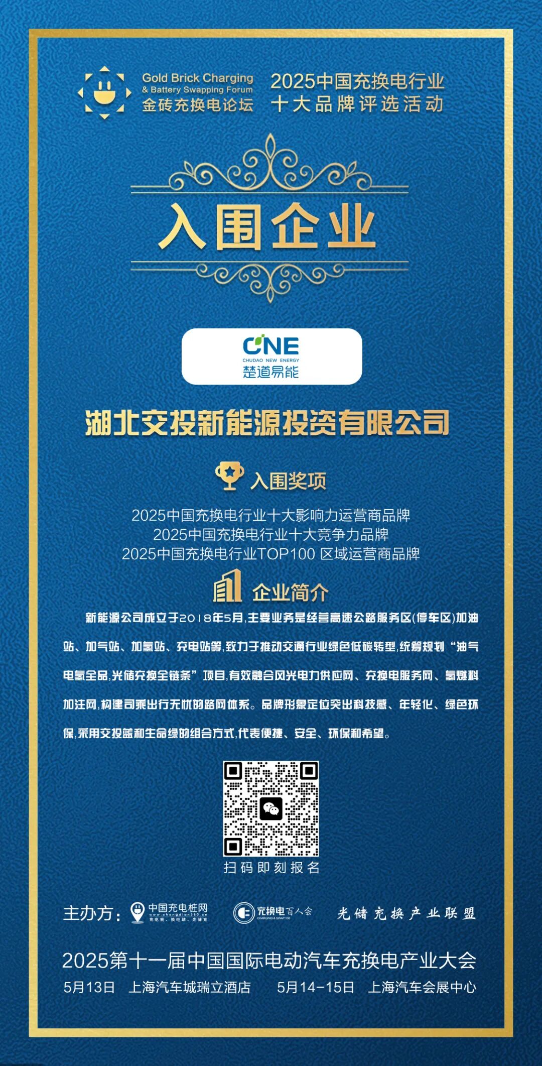 为进一步表彰更多优秀代表企业和人物所做出的卓越贡献,为了给更多的年轻科学家及企业家提供一个学习先进的榜样,由中国充电桩网、充换电百人会、光储充换产业联盟推出:2025 中国充换电行业十大品牌评选,活动简称“金砖奖”。作为中国最权威、专业的充换电品牌评选活动,本次活动将以国际化的视角呈现和挖掘充电领域最具影响力品牌企业,主办方将全力推动充换电产业品牌发展。推动线上投票,线下走访投票,专家综合评审,积极推动品牌评选,以公平,公正,公开原则,选出最具影响力企业代表,最具名族代表性品牌企业。