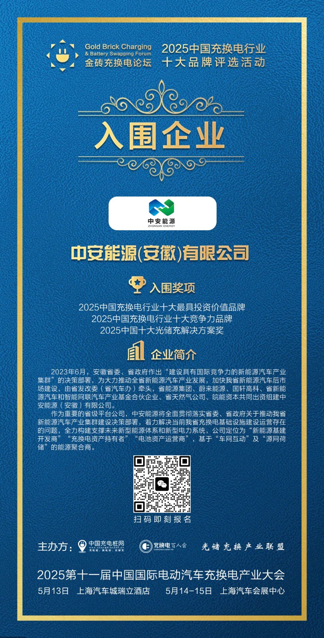 为进一步表彰更多优秀代表企业和人物所做出的卓越贡献,为了给更多的年轻科学家及企业家提供一个学习先进的榜样,由中国充电桩网、充换电百人会、光储充换产业联盟推出:2025 中国充换电行业十大品牌评选,活动简称“金砖奖”。作为中国最权威、专业的充换电品牌评选活动,本次活动将以国际化的视角呈现和挖掘充电领域最具影响力品牌企业,主办方将全力推动充换电产业品牌发展。推动线上投票,线下走访投票,专家综合评审,积极推动品牌评选,以公平,公正,公开原则,选出最具影响力企业代表,最具名族代表性品牌企业。