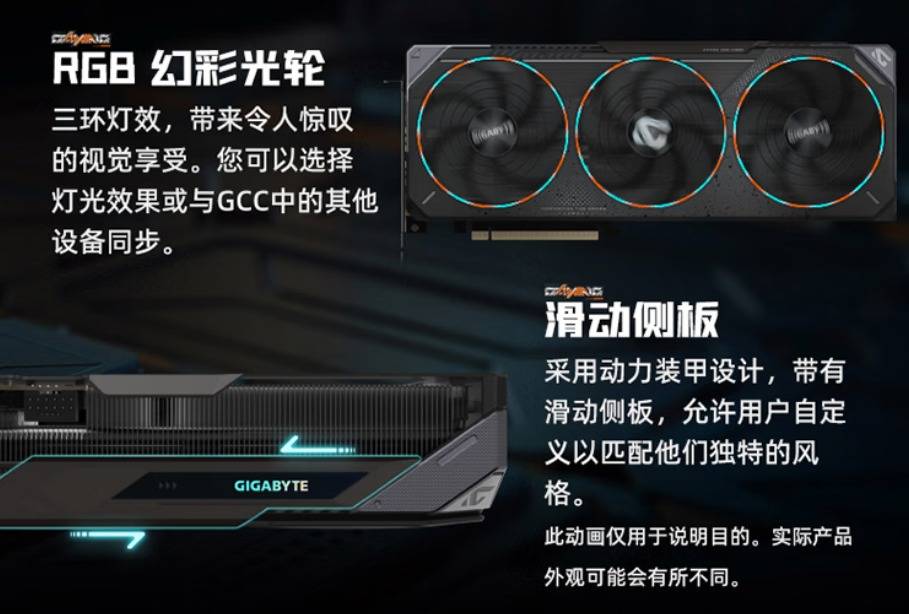 显卡外部则像盔甲一般,采用了多层结构,并结合了不同的表面材料饰面。如果仔细观察,会发现表面覆盖了细致的纹理,通过每一个细节都突出了坚固的形象,并展示了技嘉的美学设计理念。同时显卡还提供不错的RGB效果,上机以后更是惊艳,非常适合纯黑电竞主题装机。