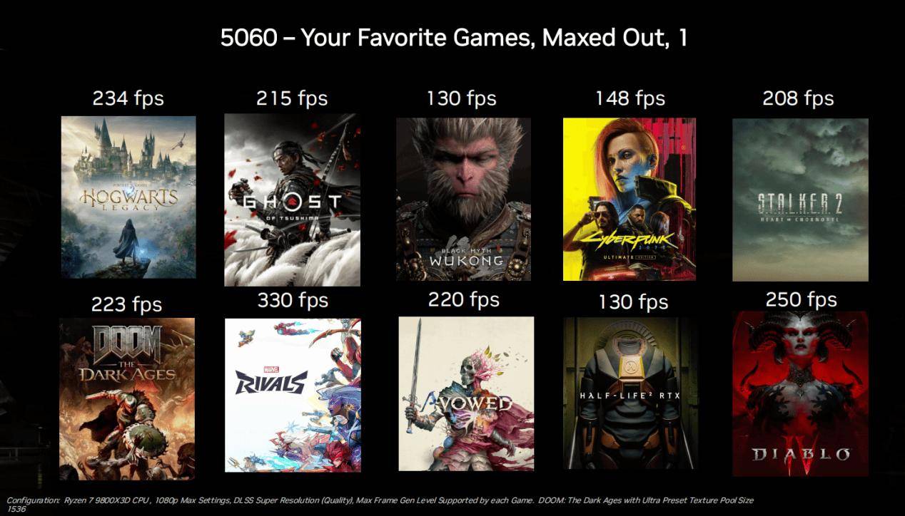 NVIDIA 表示,RTX 5060 系列面对目前主流 3A 大作如《霍格沃茨:遗产》、《对马岛之魂》、《黑神话:悟空》等时,可以在 1080P 最高画质、DLSS 超分质量模式,最高帧生成选项下带来超过 100 FPS 的体验。