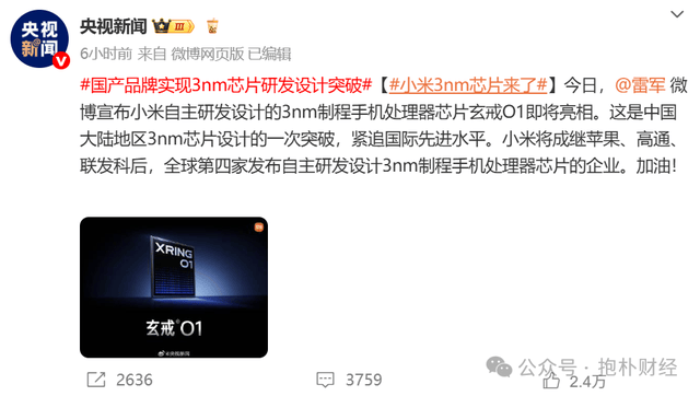 5月19日,小米玄戒O1芯片发布时间与制程官宣后,央视新闻发文评论称,这是中国内地3nm芯片设计的一次突破,紧追国际先进水平。小米将成为继苹果、高通、联发科后,全球第四家发布自主研发设计3nm制程手机处理器芯片的企业。