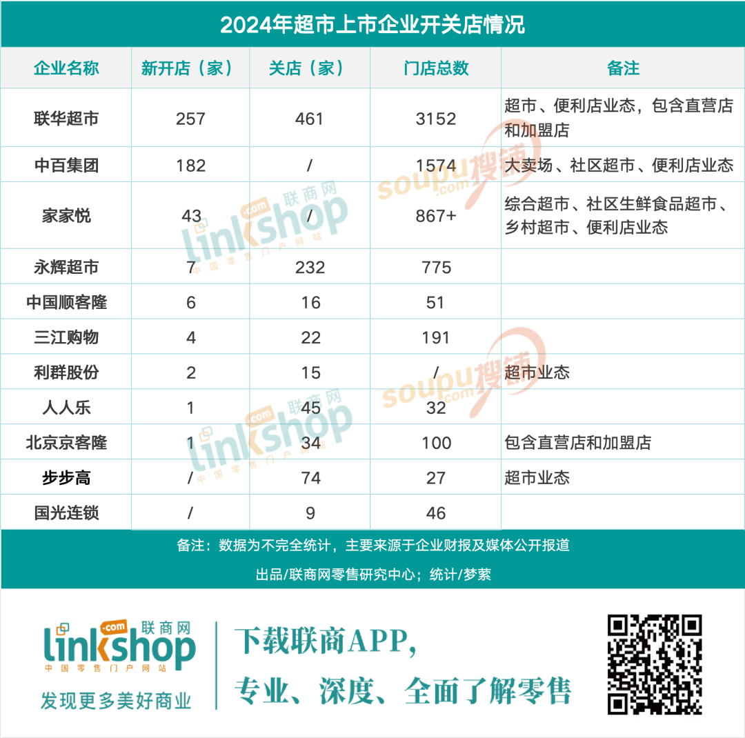 2024年,11家超市上市企业至少新开门店503家,平均新开门店46家,联华超市、中百集团2家企业新开店数超过100家;家家悦新开门店数量超过40家;永辉超市、顺客隆、三江购物、利群股份、人人乐、京客隆6家超市企业新开店数不足10家;步步高、国光连锁没有公布新增门店数量。