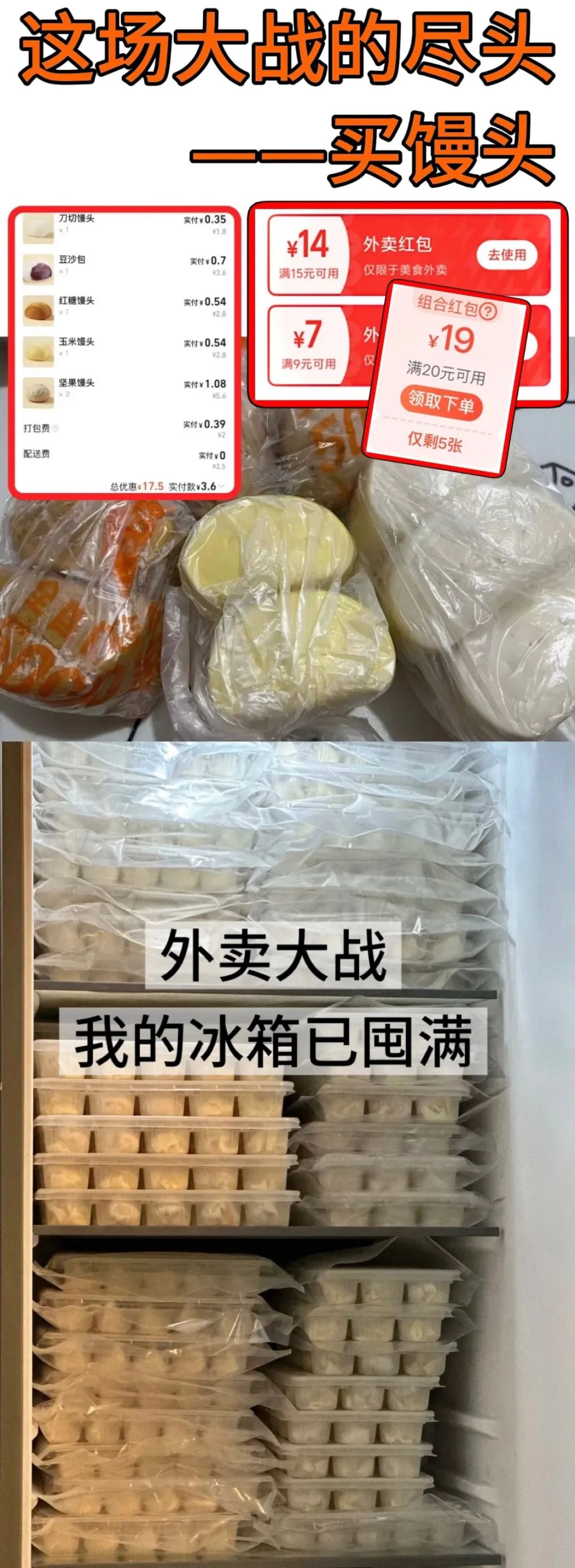 有人开始屯馒头,甚至有人将自家冰箱塞满了外卖大战抢来的云吞,3.8元24个,就算吃不动了,外卖券也不能浪费。