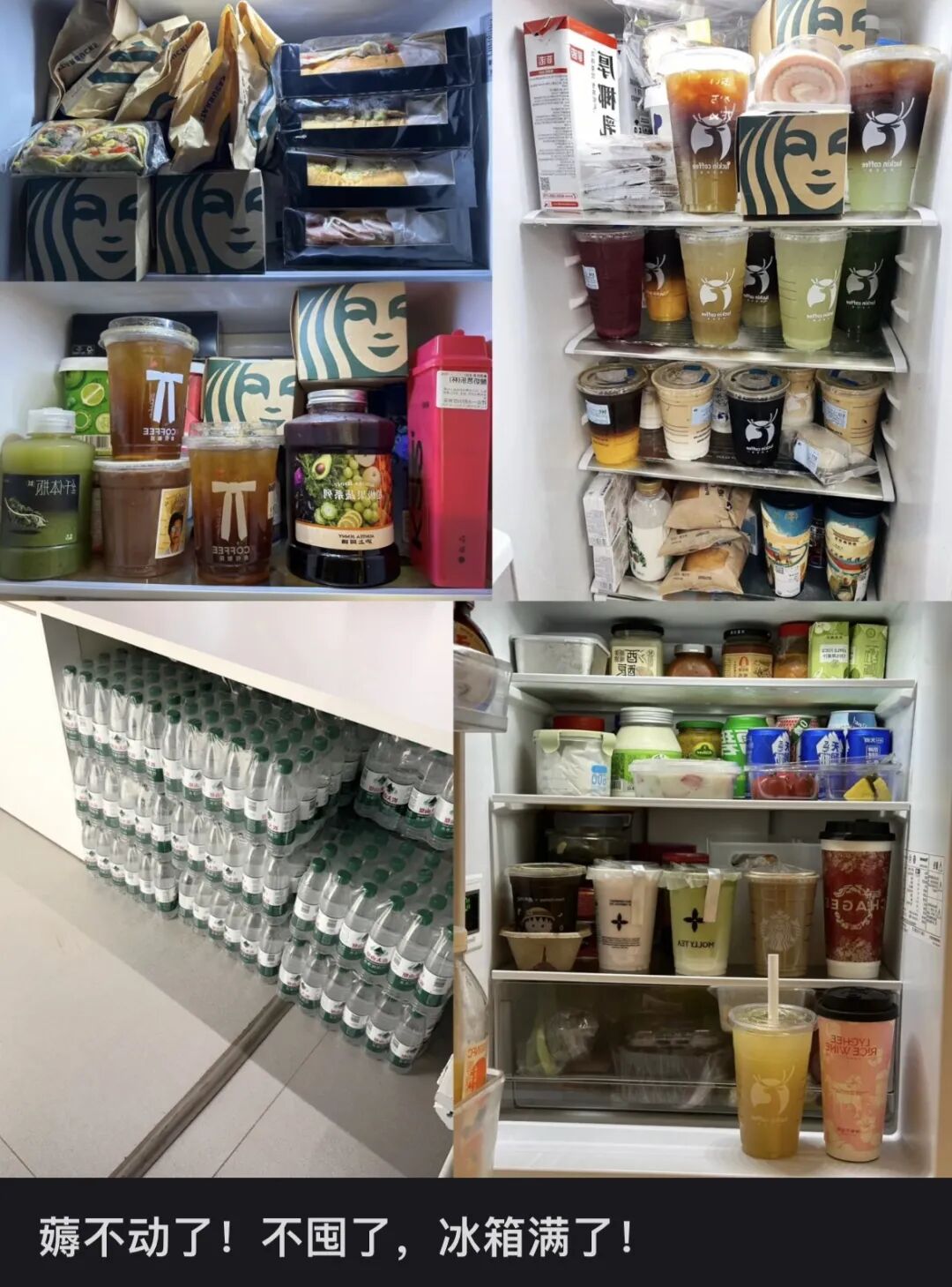 这话不假,确实有不少人开启了疯狂囤货模式,有人索性囤满了冰箱,各种茶饮咖啡从星巴克、瑞幸到蜜雪冰城,声称这周的原则是:不喝白开水。