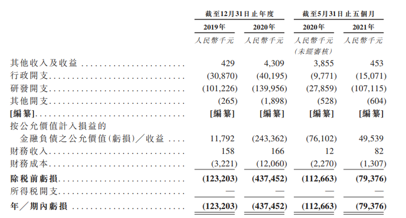 对于公司多年亏损的现状,阿诺医药解释称,几乎所有的经营亏损都由研发开支、行政开支及按公允价值计入损益的金融负债的公允价值变动所致。其中,2019年、2020年以及2021年前五个月,阿诺医药研发开支分别高达1.01亿元、1.4亿元和1.07亿元。