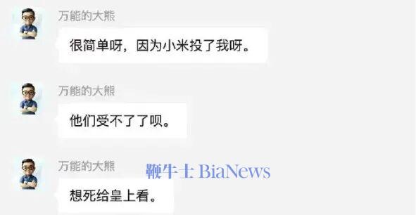 这种对立不是一时兴起,而是长期积累的结果。米粉们早已把抵制他当成一种“共识”,双方在网络上多次交锋。可谁也没料到,小米居然会转身向这个“宿敌”递出合作橄榄枝。更让米粉无法接受的,是“万能的大熊”在群聊中那副志得意满的姿态。网传截图显示,面对他人的质疑,他轻描淡写地回应:“因为小米投了我呀,他们受不了了呗,想死给皇上看。”