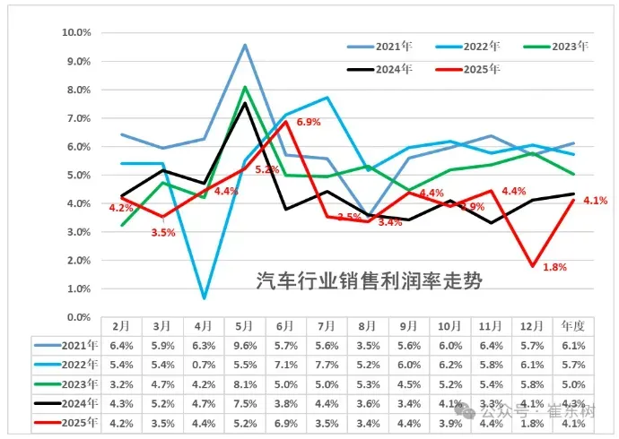 1月27日,乘联分会秘书长崔东树最新披露的数据显示,2025年1-12月汽车行业销售利润率进一步降至4.1%,仍处于历史低位,相对于下游工业企业利润率5.9%的平均水平,汽车行业仍偏低。其中12月1.8%的利润率更是创下近期低点,环比下降2.6个百分点,同比下降2.3个百分点。