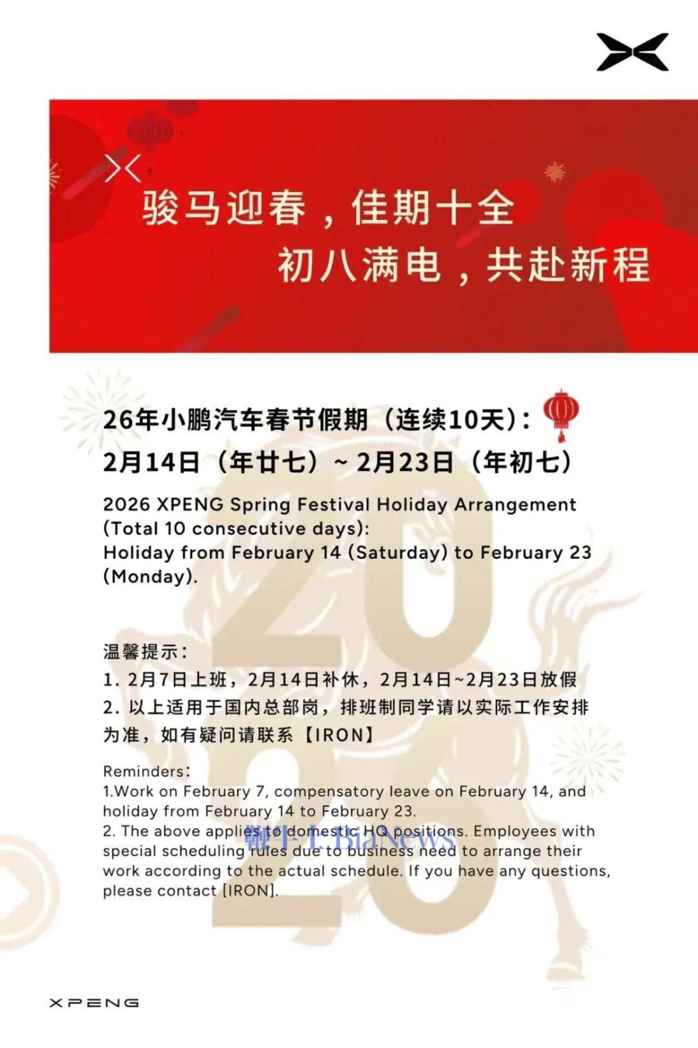 26年小鹏汽车春节假期(连续10天):2月14日(年甘七)~2月23日(年初七),2月7日上班,2月14日补休,2月14日~2月23日放假。