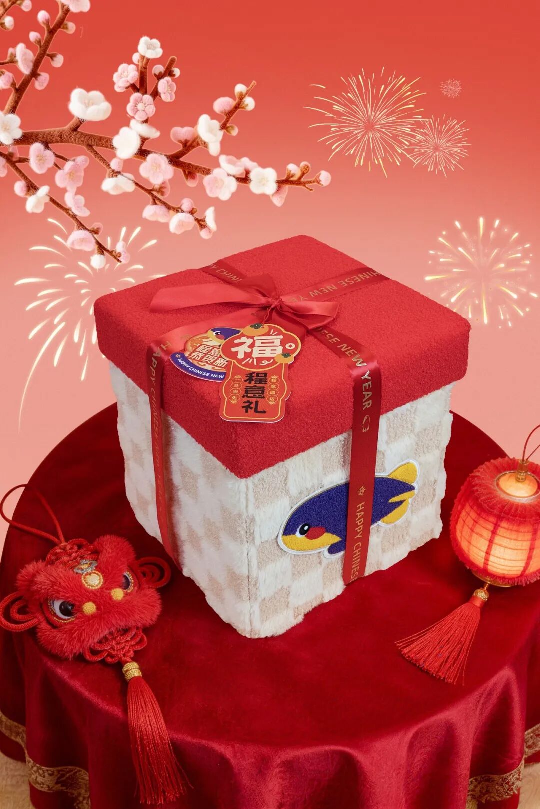礼盒内含印刷套组,多功能手提灯笼,陶瓷装饰盘,蚂蚁公仔,福禄寿喜红包,春联,福字贴。