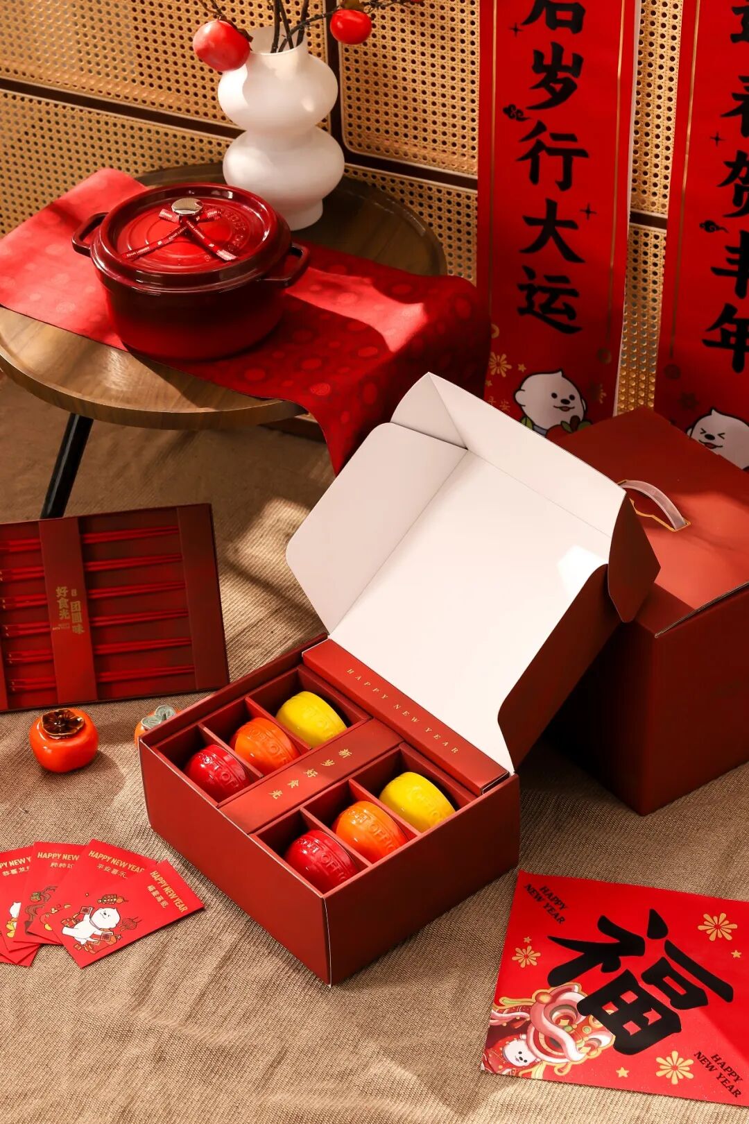 开盒如入画,器物承吉意:陶瓷葫芦宝瓶、八角馈岁盘等器物再现古画形制;对联福字、利是红包、年味糕点裹满团圆暖意;敬献兼具仪式感与烟火气的新春盛宴。
